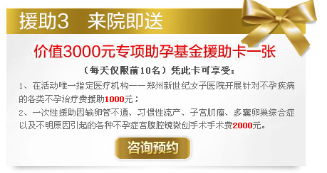 在2014年7月28日-12月31日期间,新世纪女子医院特举办“2014助孕计划暨专项基金援助工程”,凡通过网络或电话预约的初诊患者,均可享受如下优惠: